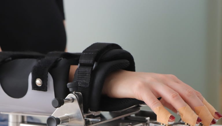 Patients who are barely able or unable to grasp can perform hundreds of robot-assisted grasping movements. Active participation of the patient’s affected hand is promoted by biofeedback and assist-as-needed interactions.